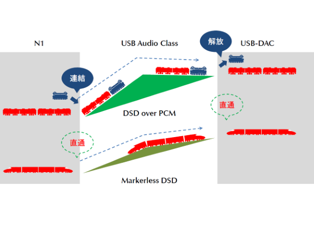 DSDデータをN1からUSB-DACに送るためには、USBを経由する必要がありますが、通常のUSBオーディオクラスではPCM以外は考慮されていないため、そのままでは送れません。このため、DSDデータをPCMデータと同じように送れるよう、細かく切って一つ一つ「マーカー」と呼ばれるデータをつけます。受け取ったUSB-DAC側でも同じように一つ一つからマーカーを外してDSDデータを取り出します。