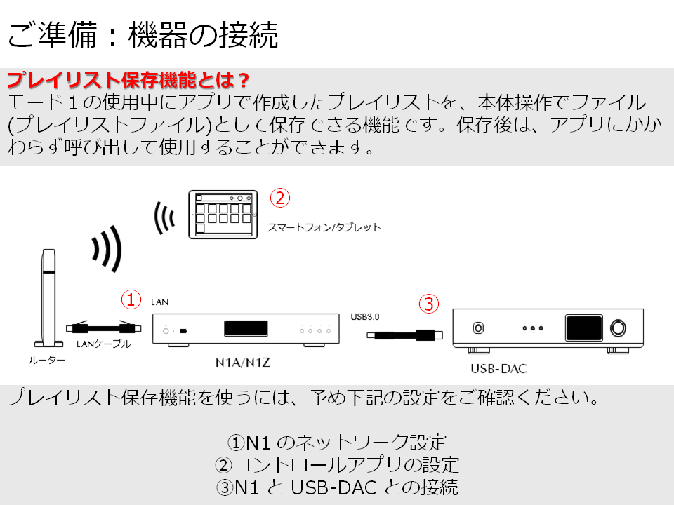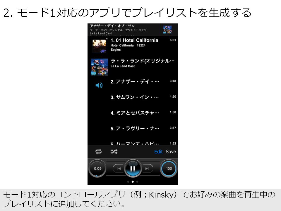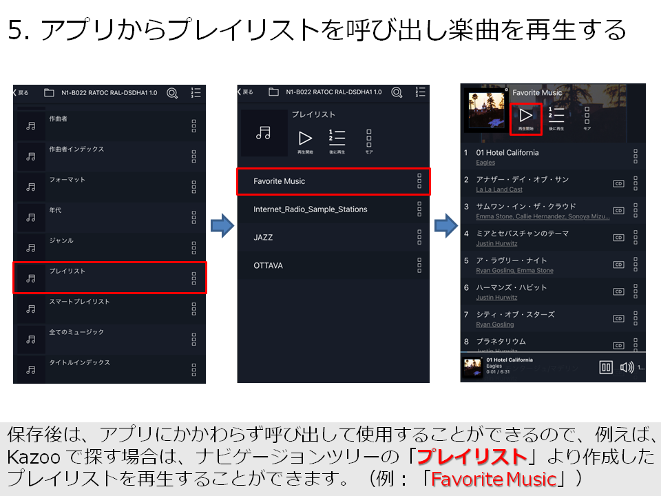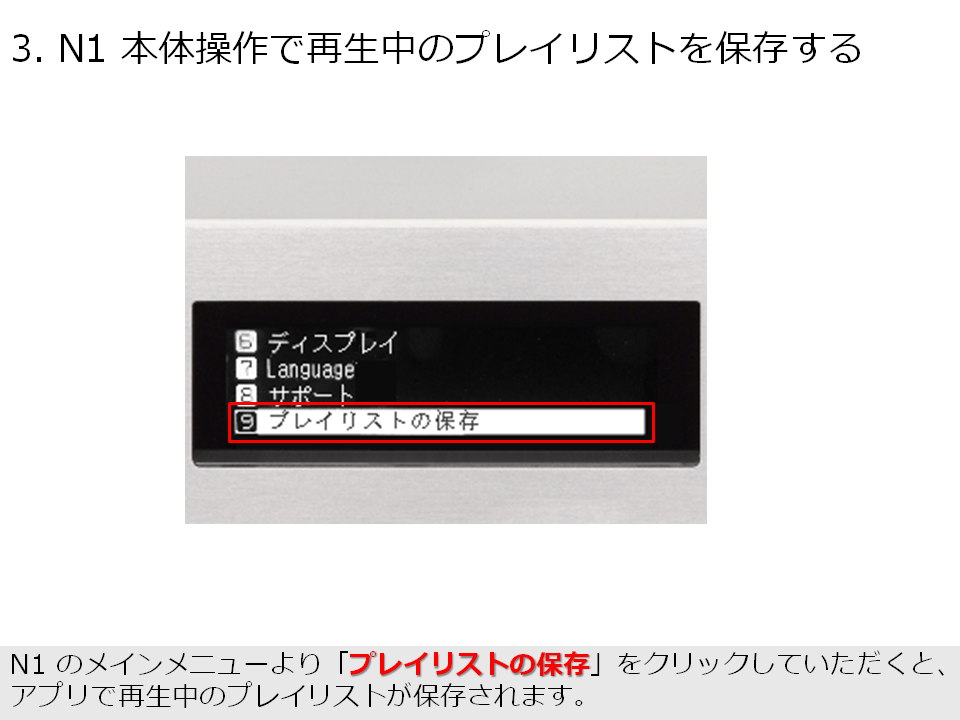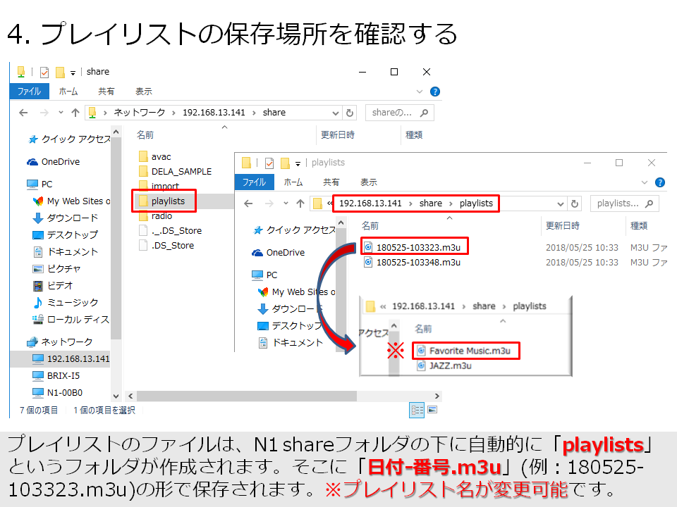 ※アプリ上でプレイリストを保存できる場合は、そちらの機能をご利用いただくほうが簡単です。ただし、アプリ上に保存したリストはデータベース再構築で使用できなくなる場合があります。本機能で作成したプレイリストは、データベース再構築やバージョンアップにかかわらず使用できます。