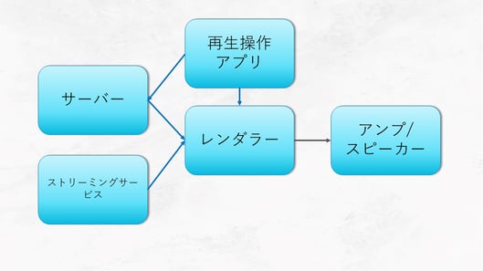 この時、再生操作アプリではレンダラーの再生を操作します。再生操作アプリはネットワークプレーヤーのメーカーが推奨するアプリをご使用ください。(メーカー推奨以外のアプリでも使用できる場合はありますが、動作の保証はされませんので自己責任でご使用ください)