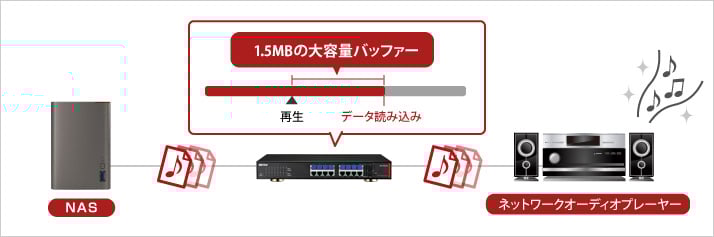1.5MBの大容量パケットバッファーにより、オーディオ機器へ転送されるデータをスイッチングHubに一時的に保持。オーディオ機器の再生速度に合わせてデータを読み出すことができます。