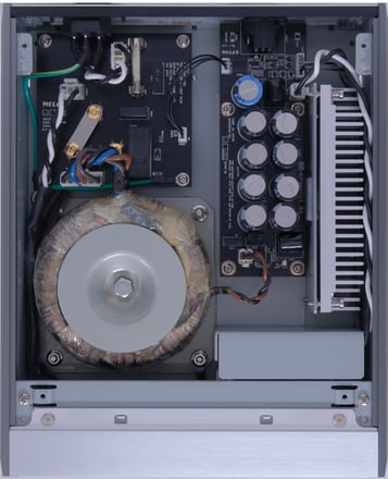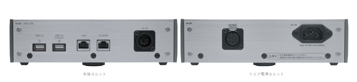 贅沢に独立筐体とした電源ユニット部にもヘッドユニット部と同様に5面アルミ筐体、2mm厚鋼板シャーシを採用。TAOC社製鋳鉄インシュレーターで三点支持しています。N10のために設計されたトロイダルトランスとコンデンサバンクを組み合わせ、Neutrik社製コネクタを採用した専用ケーブルを介してヘッドユニットに電源を供給します。ヘッドユニット側の電源断に連動し、動作状況はLEDで示します。