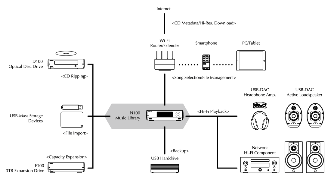 N100とUSB-DACヘッドフォンアンプや、ハイレゾ対応アクティブスピーカーを組み合わせれば、コンパクトなハイファイ・オーディオシステムが出来上がります。