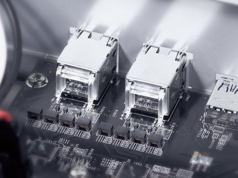 LED点滅ノイズによる伝送ラインへの影響を排すライトパイプ式LEDインジケーターを内蔵したRJ-45コネクタと均質な品質が保証された超小型自動巻パルストランスを搭載。